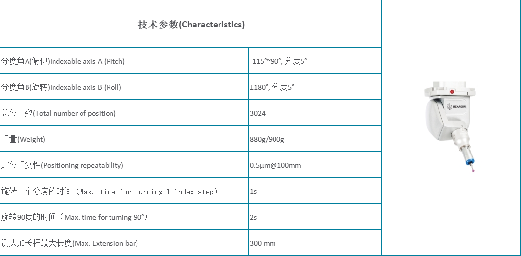 HH-AS-T5可在豎直水平兩個方向自動旋轉,5°的精細分度量確保有多達3024個測頭角度組合.旋轉90°僅需兩秒鐘, 可配置長達300mm的加長桿;可連接各種觸發式測頭、模擬掃描測頭和非接觸式測頭。特別設計的結構使得HH-AS-T5在安裝時,部分結構可深入測量機Z軸內部,節省了安裝空間尺寸,因而增大了測量空間,標配HP-S-X1S測頭系統 ,搭配M3螺紋探針,允許探針總長度范圍豎直方向在20-115mm,水平方向0-20mm之間